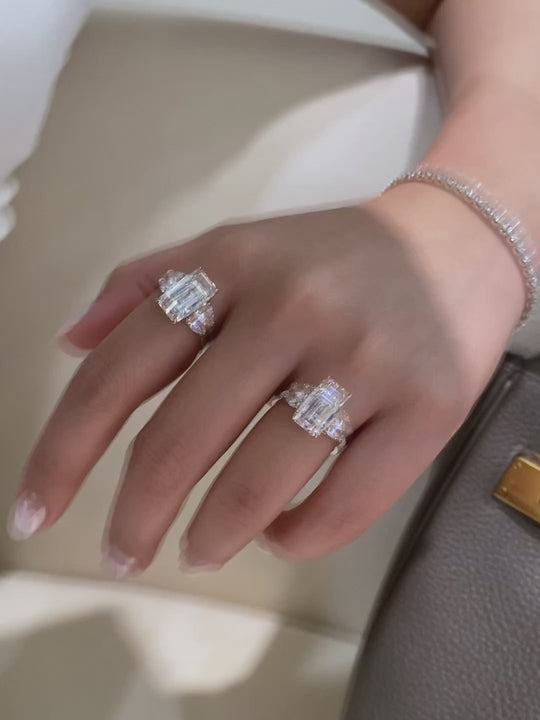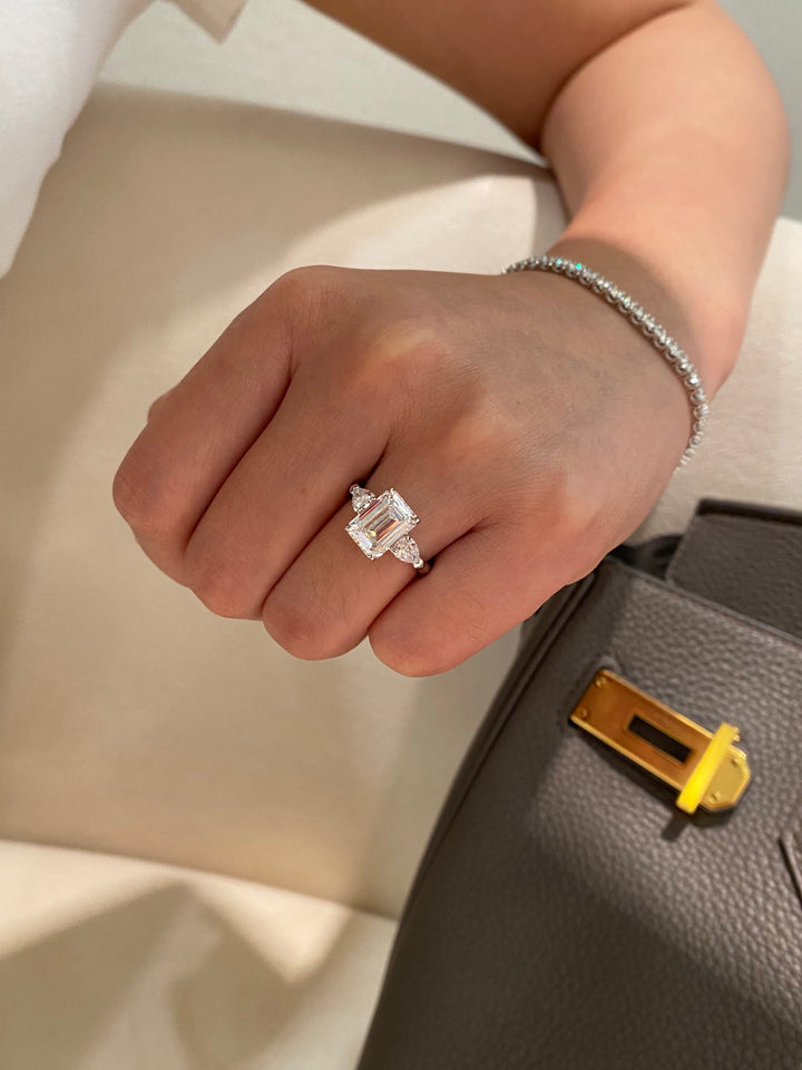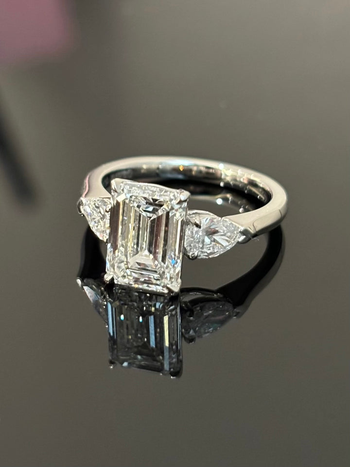 Emerald Cut Diamond Ring | IGI Certified, E Color, VS Clarity, Three-Stone Design with Pear-Shaped Side Stones 3-Carat