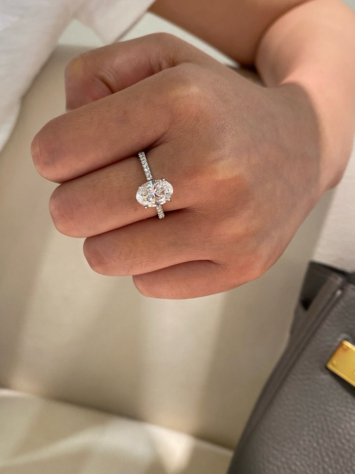This classic three-stone engagement ring features an exquisite oval-shaped center stone (F color, VVS clarity, 10ct), complemented by two stunning heart-shaped side stones. The perfect fusion of luxury and romance, this design is crafted to last for generations.