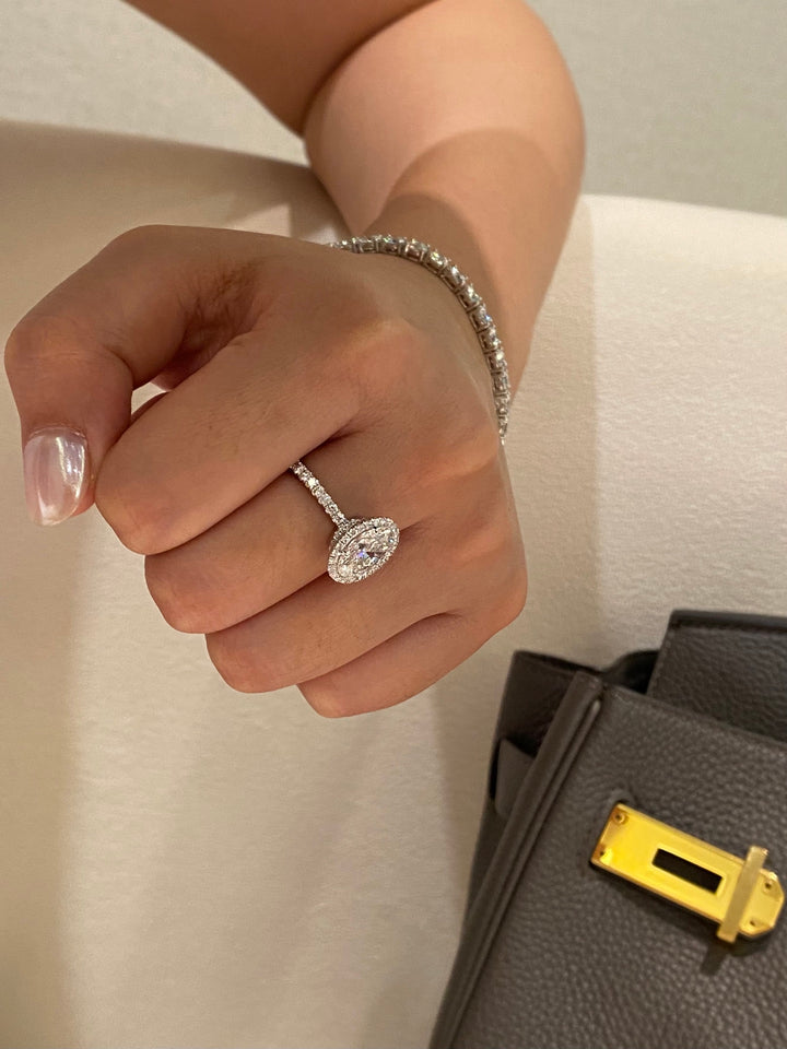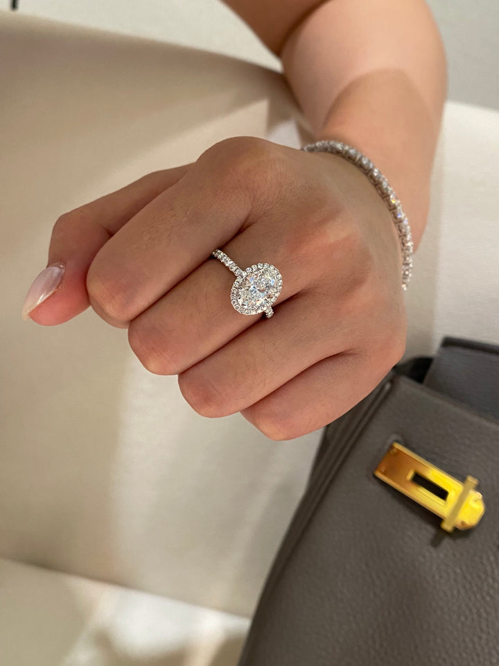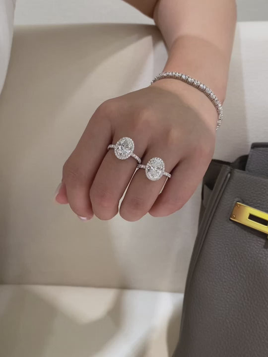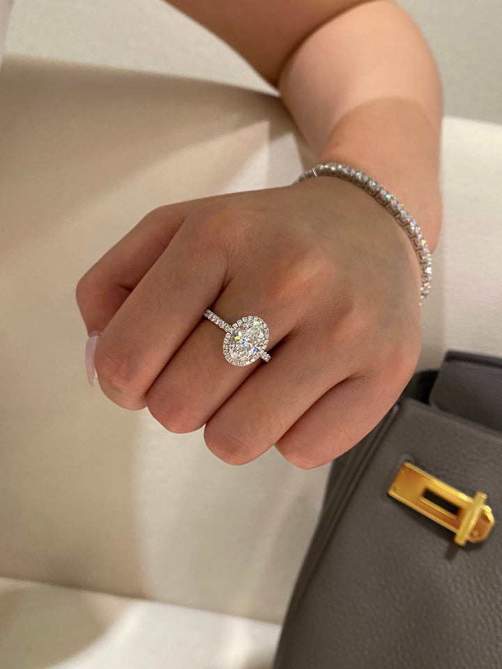 Embrace timeless elegance with this stunning oval solitaire ring from Dulci Diamond. The exquisite 2ct center stone (E color, VS clarity) is beautifully encircled by a halo of shimmering pavé diamonds, creating an irresistible brilliance that looks even larger on the hand. Designed to catch the light from every angle, this ring offers a perfect blend of gentle elegance and dazzling sparkle.