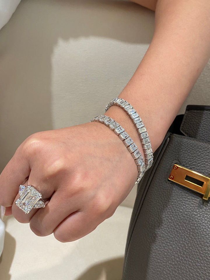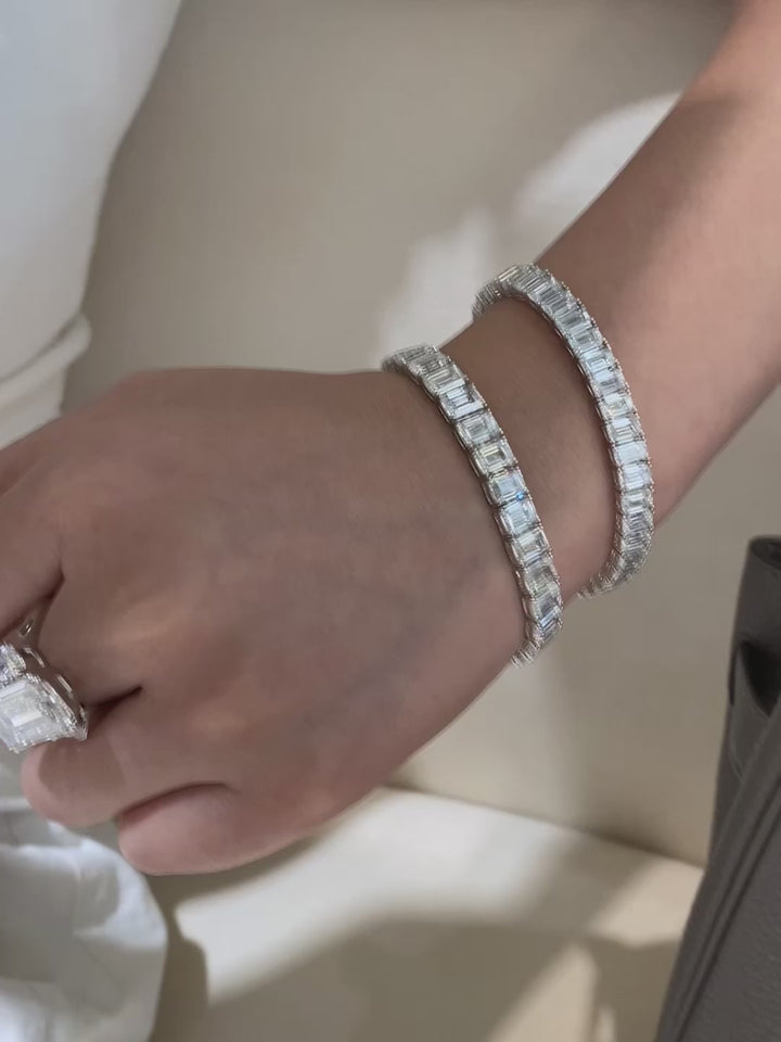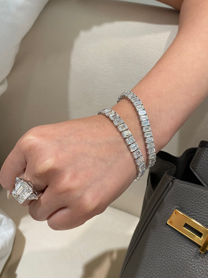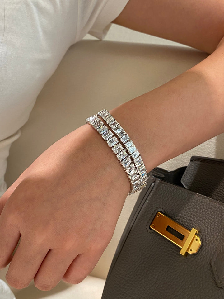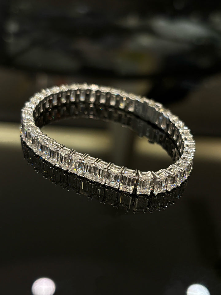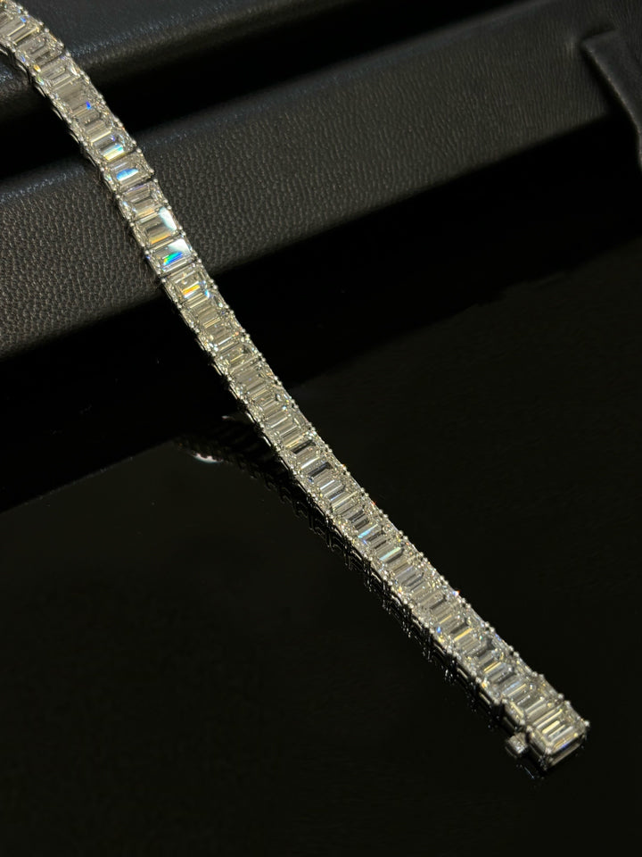 Embrace understated luxury with our modern emerald cut tennis bracelet. Featuring impeccably cut emerald shape diamonds in exceptional DEF color and VS-VVS clarity, this piece exudes refined elegance. Its clean lines and sophisticated design make it the perfect accessory that transitions seamlessly from day to night, offering both premium quality and versatile style.