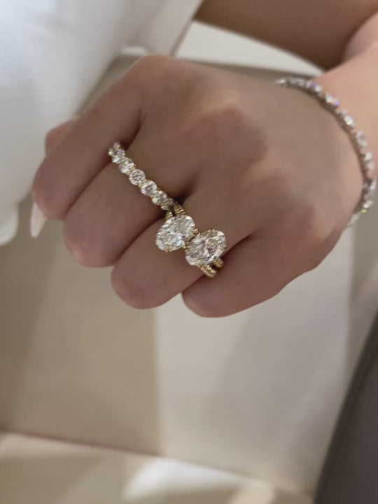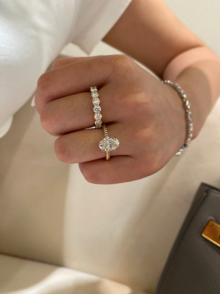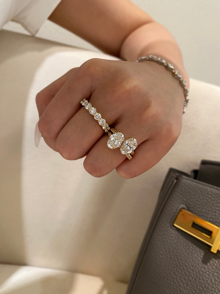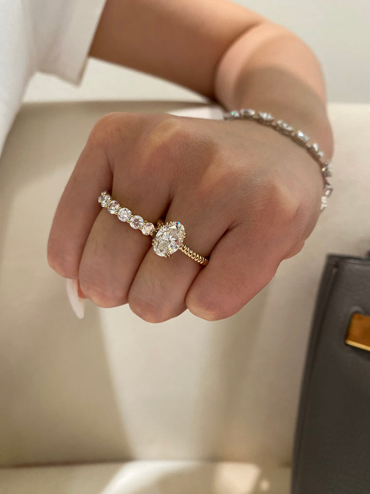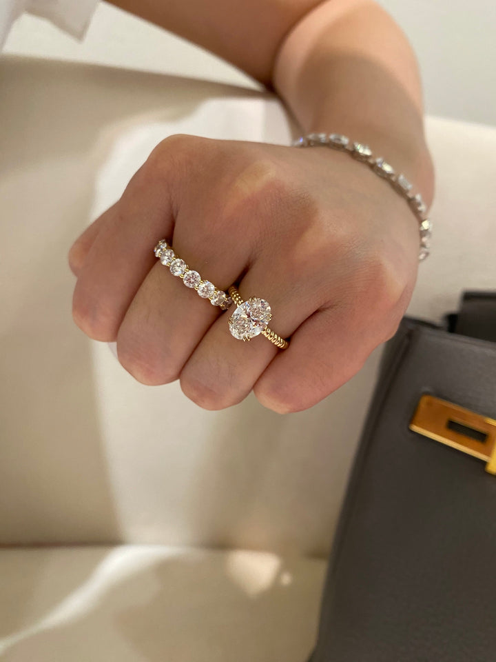 Experience the perfect blend of classic elegance and modern flair. This stunning oval solitaire ring features a brilliant 2ct center stone (D color, VS clarity), celebrated for its exceptional whiteness and sparkle. It's gracefully set upon a beautifully crafted cable twist band, a design that adds texture and vintage-inspired charm. This ring is uniquely versatile, looking equally breathtaking when worn alone as a statement piece or paired with other bands for a chic, stacked look.