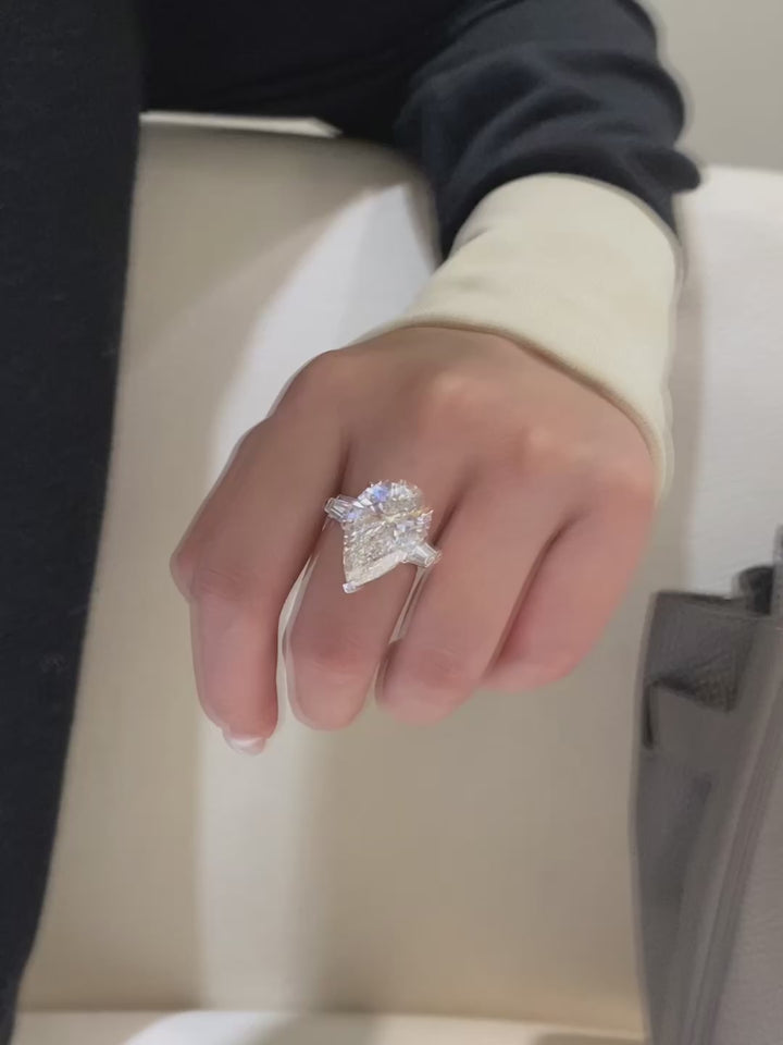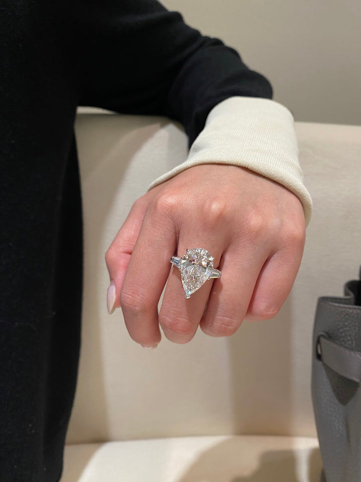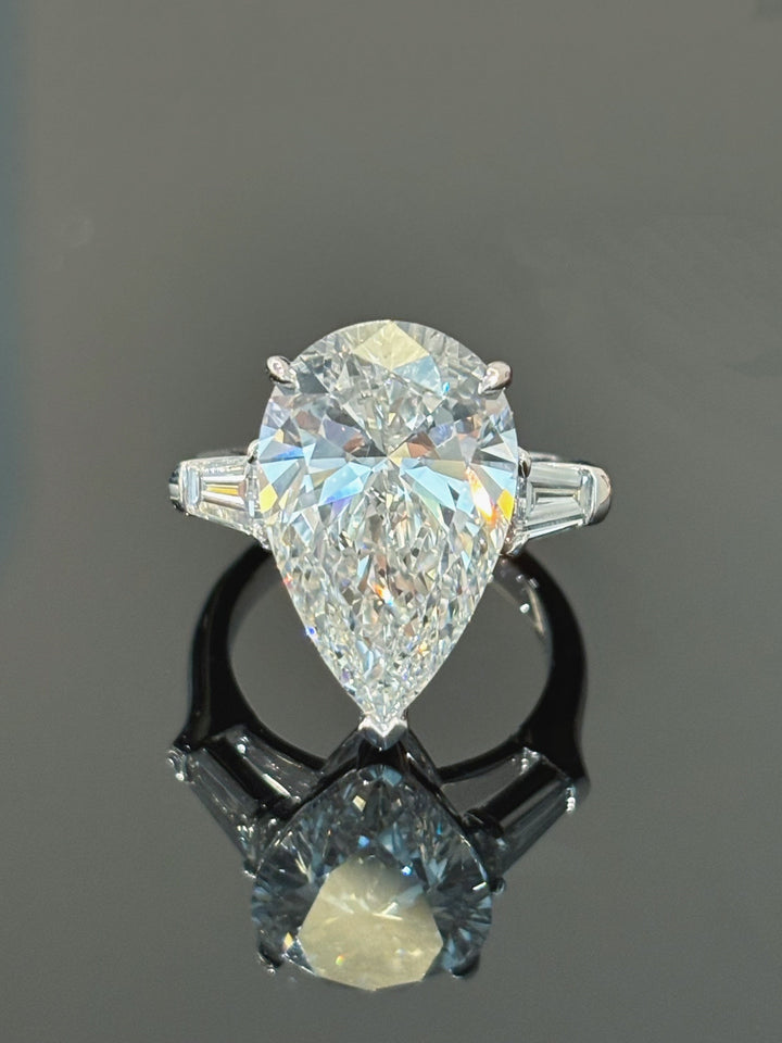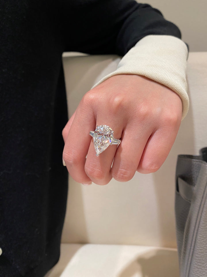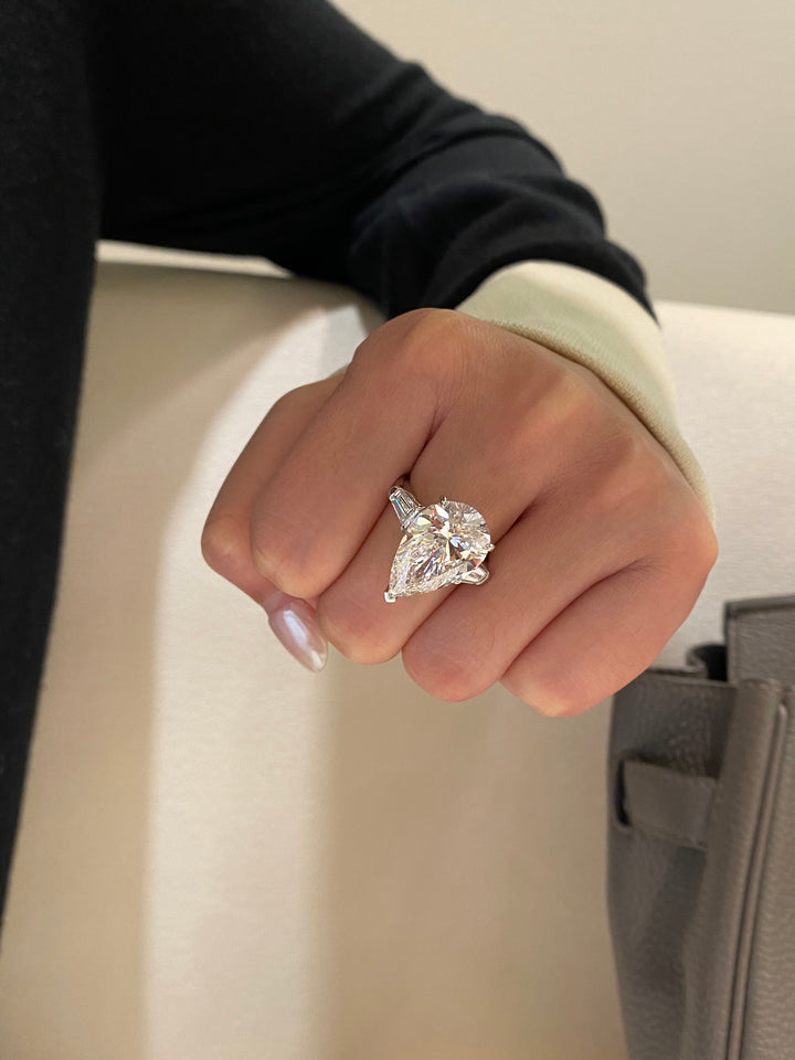 Where timeless design meets modern grandeur. This exquisite three-stone ring features a magnificent 10-carat center stone, elegantly framed by two tapered baguette diamonds. The sophisticated combination creates a look that is both luxuriously bold and perfectly elegant—a piece you'll adore for a lifetime.