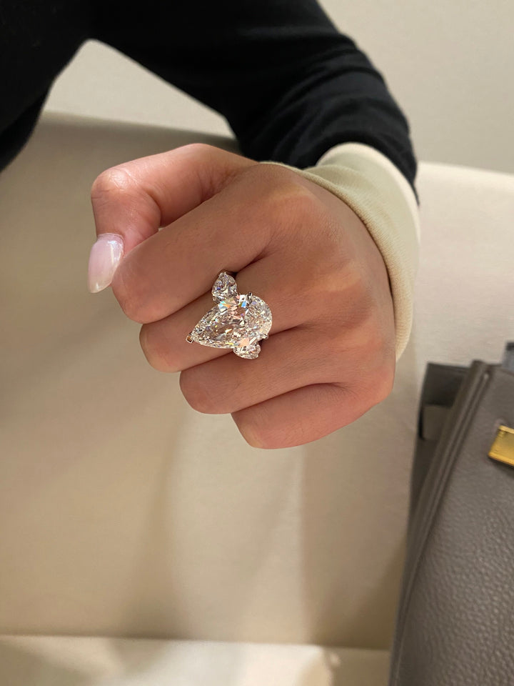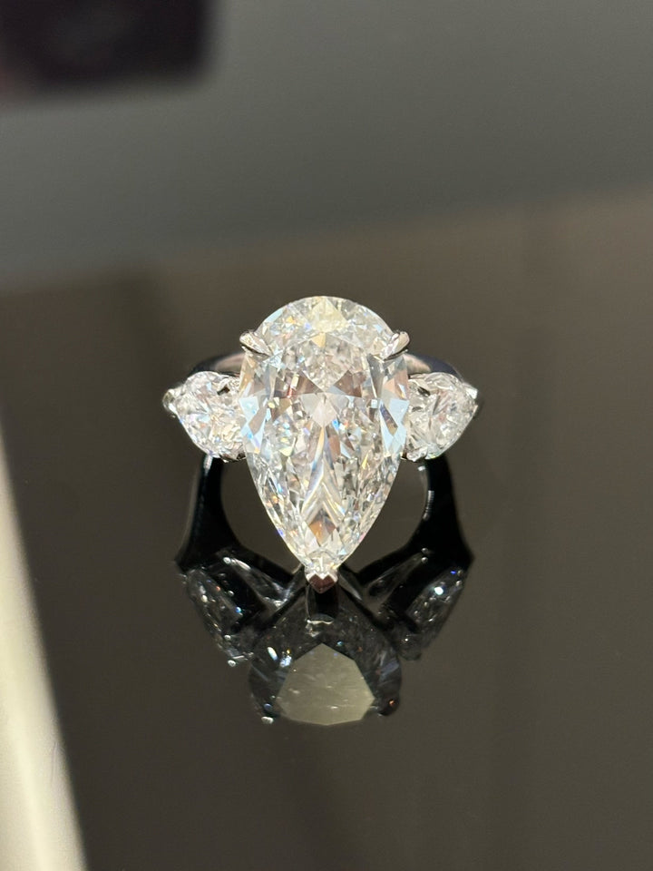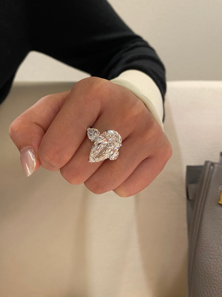 Experience the perfect balance of luxury and elegance. This stunning three-stone ring features a magnificent 10-carat oval center diamond, gracefully accented by two sparkling teardrop side stones. The classic design exudes both grandeur and sophistication, creating a piece you'll cherish forever.
